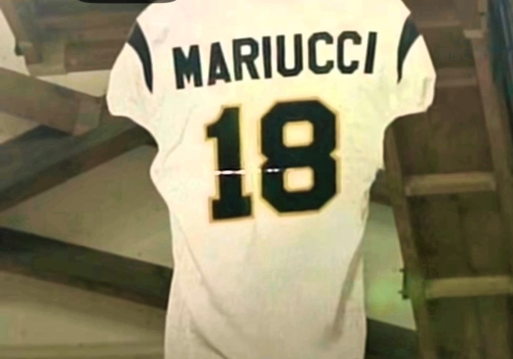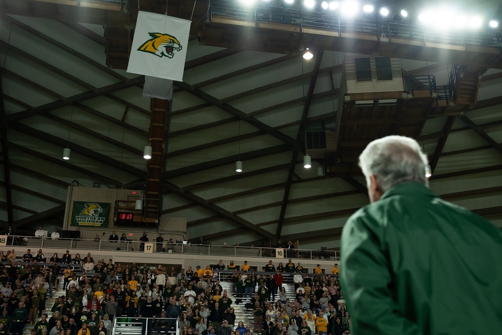“When you look up at that jersey, I want you to think to yourself, that the jersey represents a team,” Mariucci told the crowd of 3,216 at halftime of the NMU game against Grand Valley State. “It represents a team that has accomplished something that nobody has ever accomplished in the history of the world.”
