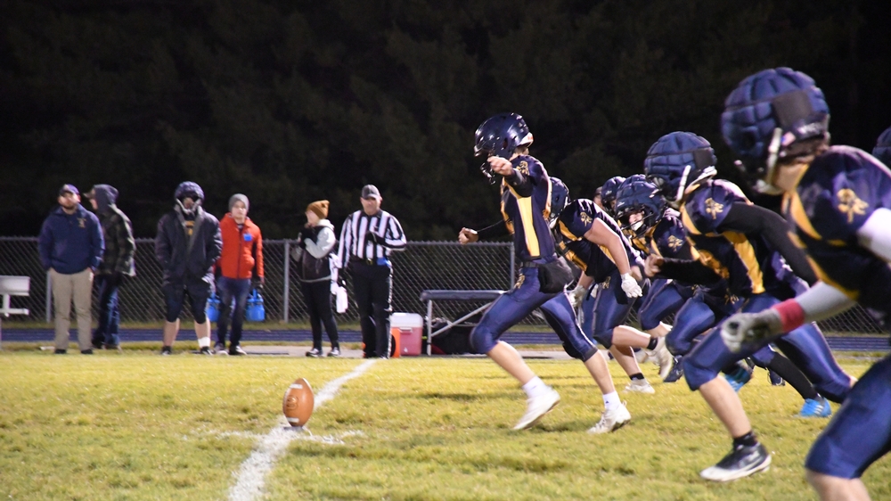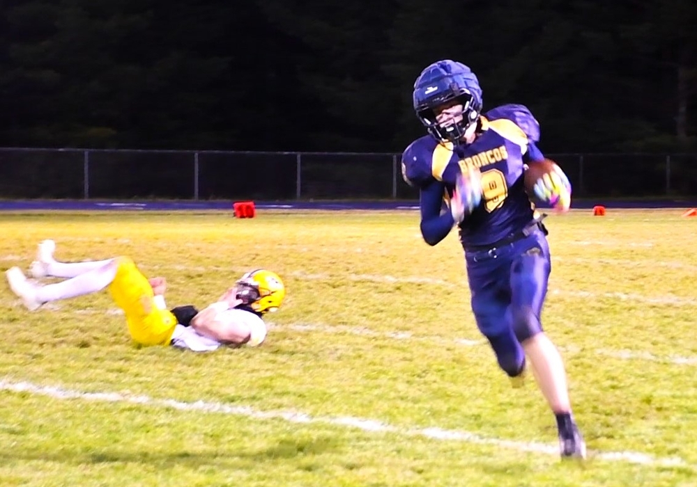 Andy Johnson added two touchdown runs, Ethan Oswald scored on a 20-yard run, and Dane Schmitt kicked a 34-yard field goal in the victory. The Broncos also intercepted three passes on defense, all of them in the first half, by Brayden Derouin, Ben Knauf, and Oswald..
