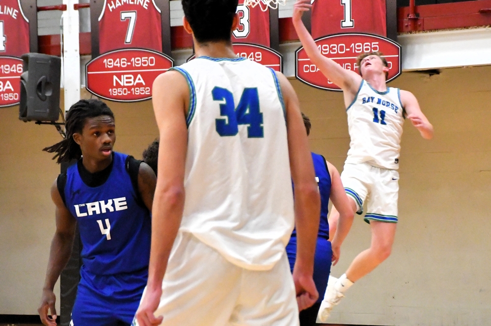 Bay had four men score in double figures and posted a 79-69 win. The game was played in a neutral gym at Hamline University in St. Paul, Minn., a gym that claims to have hosted the first-ever college basketball game nearly a century ago.