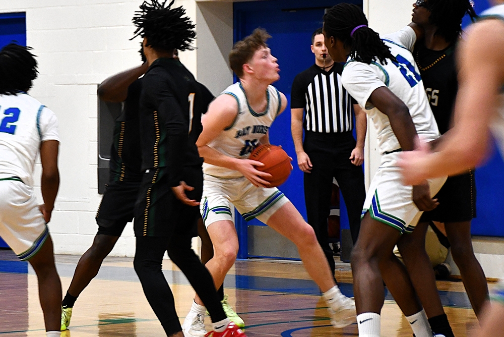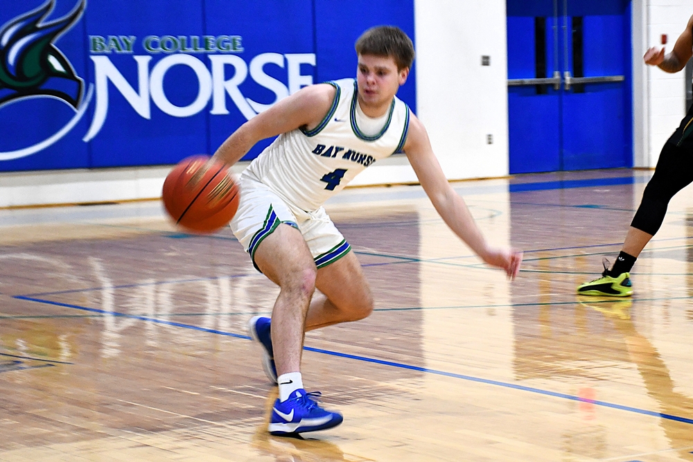In the Friday win, the first half saw the Vikings take small leads until about midway through the half. That's when Trevor Nolan got hot, knocking down three triples, and Taveon Vann threw down eleven points, including a slam dunk that got the crowd onto its feet. Bay College led at halftime, 45-38.