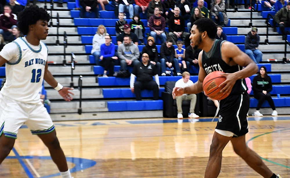 Kyle Hustrulid, who played tough defense in the first half on Smith, got a key “hustle basket” down the stretch with 1:42 left, giving Bay an 81-80 lead. Delta's Deontey Gray replied with a basket with 1:11 to play, putting the Pioneers ahead, 82-81.