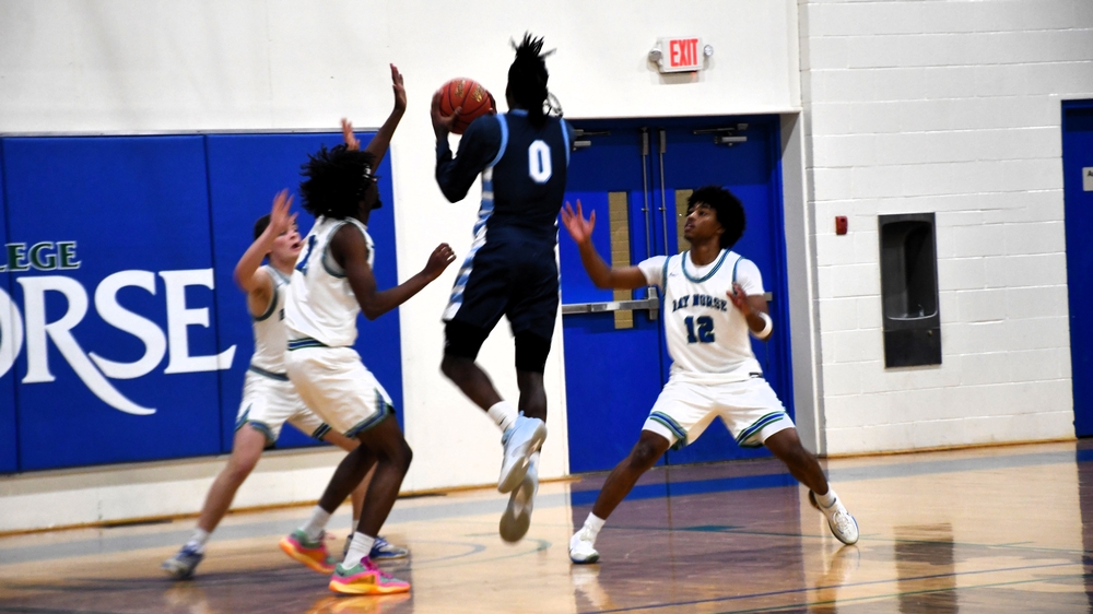 Bay College led, 32-28, late in the first half, after Trey Frye scored twice inside and Ziad Abouali also scored in the paint. But the Lakers finished the first half on a 13-0 run to take a 41-32 lead at halftime, and they scored the first five points of the second half to go up by double digits at 46-32.