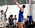 The Morey Courts, an AAU facility surrounded by white curtains, where you can hear whistles and buzzers sounding in courts on the other side of the curtains, was the venue. It was filled with four-row high bleachers around the entire room, and it was filled with screaming fans, many of them Laker baseball players, wearing “Beat Bay” shirts.