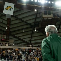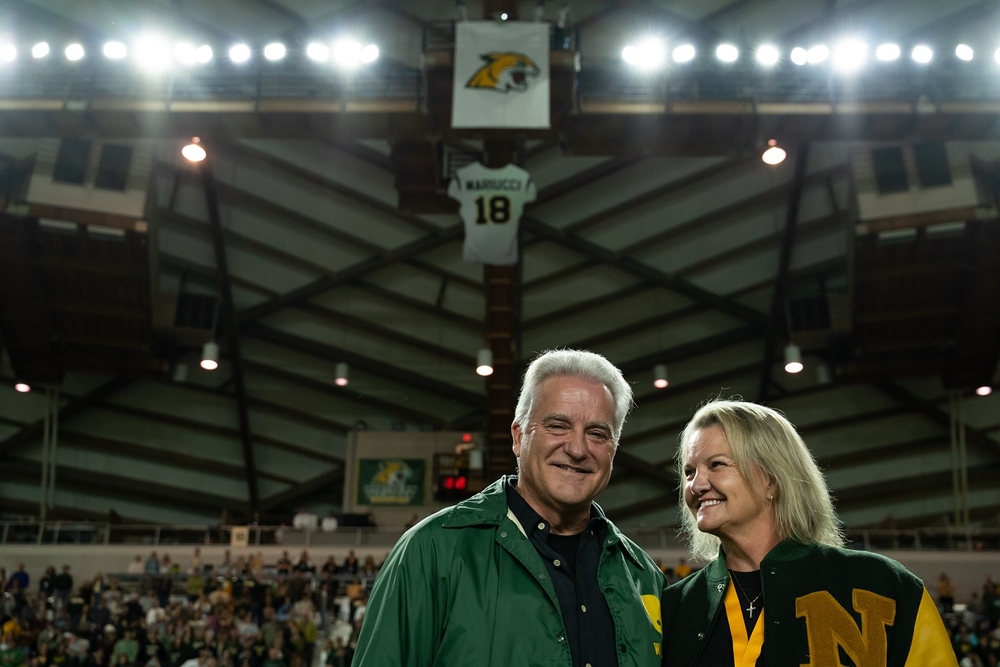 “When you look up at that jersey, I want you to think to yourself, that the jersey represents a team,” Mariucci told the crowd of 3,216 at halftime of the NMU game against Grand Valley State. “It represents a team that has accomplished something that nobody has ever accomplished in the history of the world.”