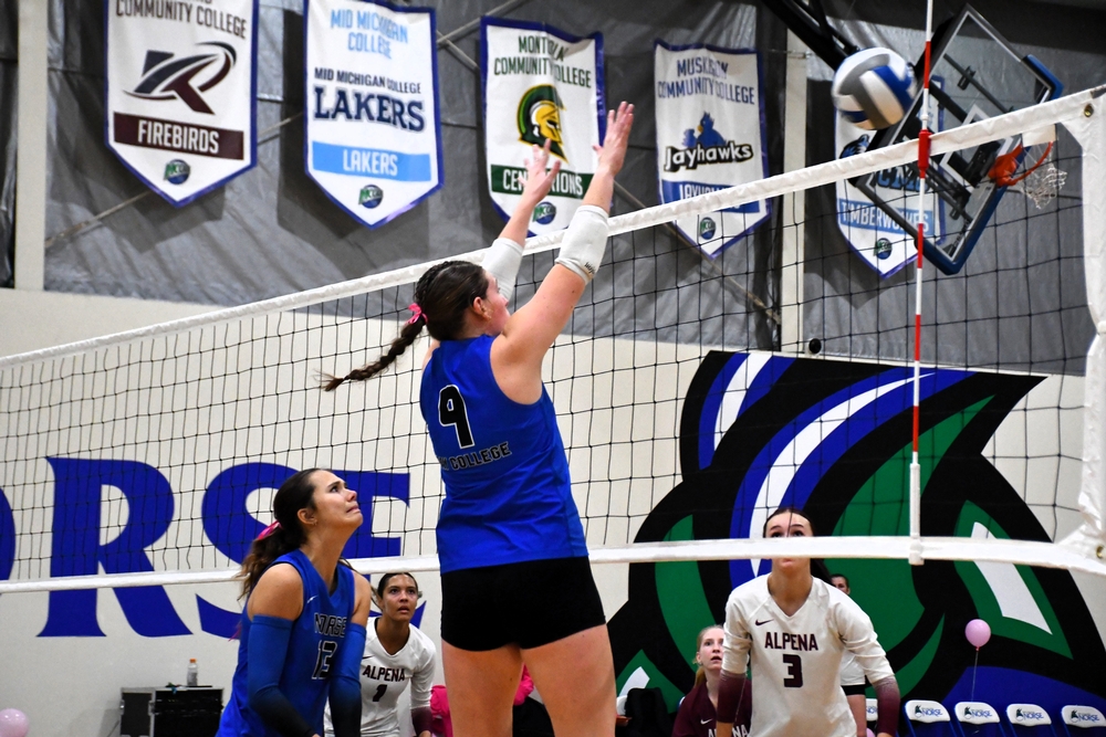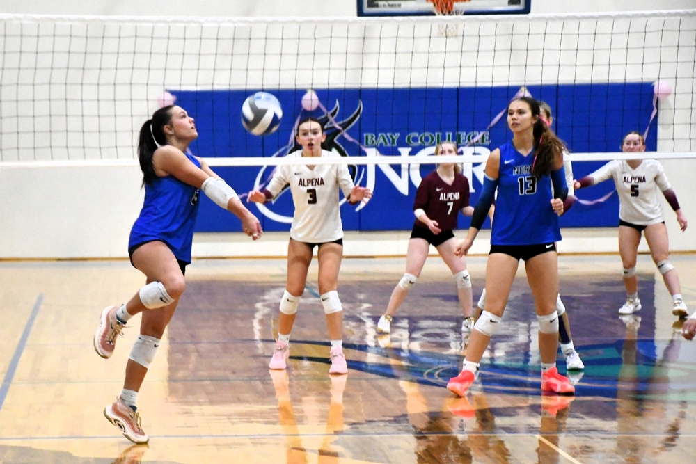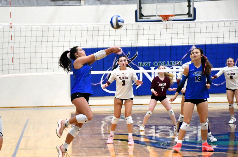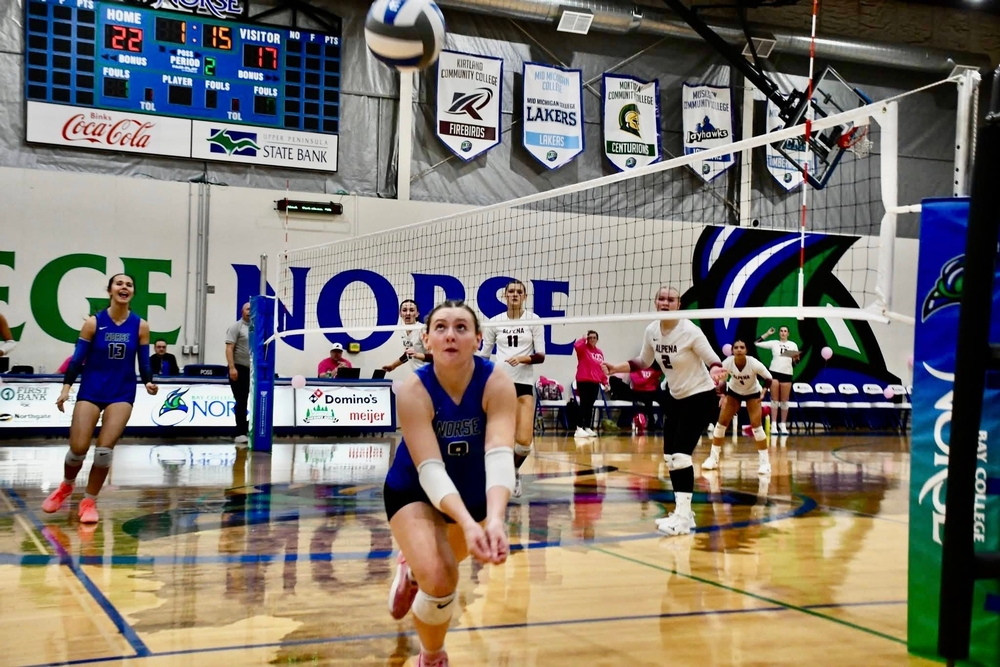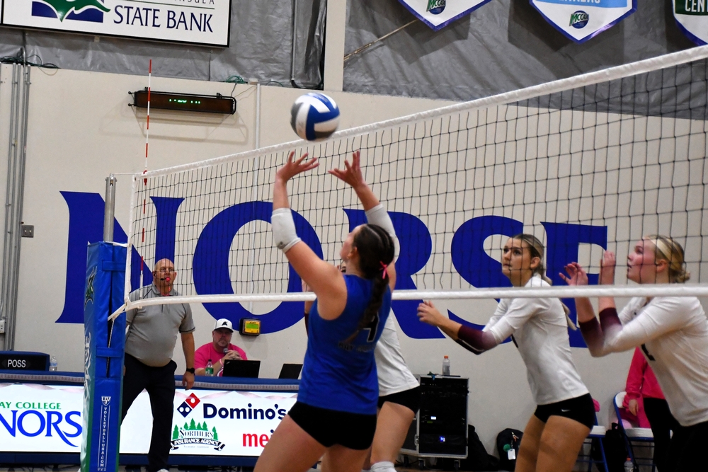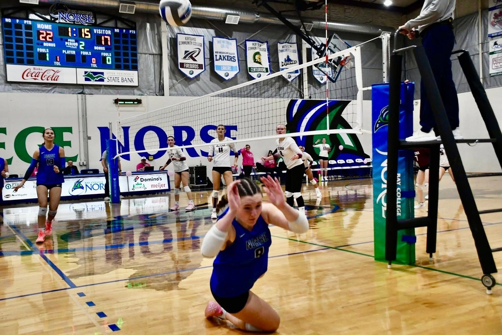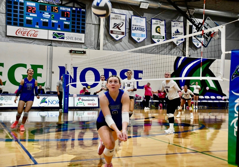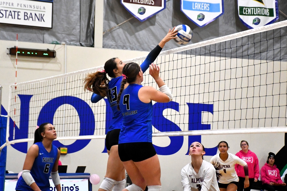 The Norse won the match over the Alpena Community College Lumberjacks, 25-21, 26-28, 25-21. and 25-21.
