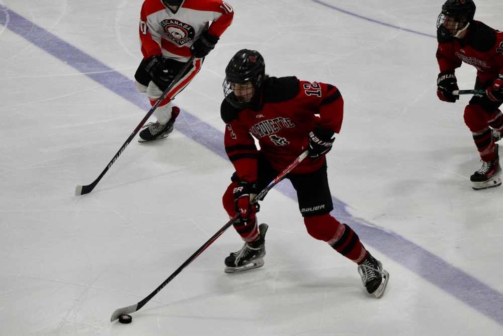After goalie Parker Neverhoven stopped Escanaba's leading scorer Graham Johnson on a breakway (for the second time in the game), Marquette took a 4-2 lead on a nice give-and-go on a 2-on-1 between LeMire and Pond.