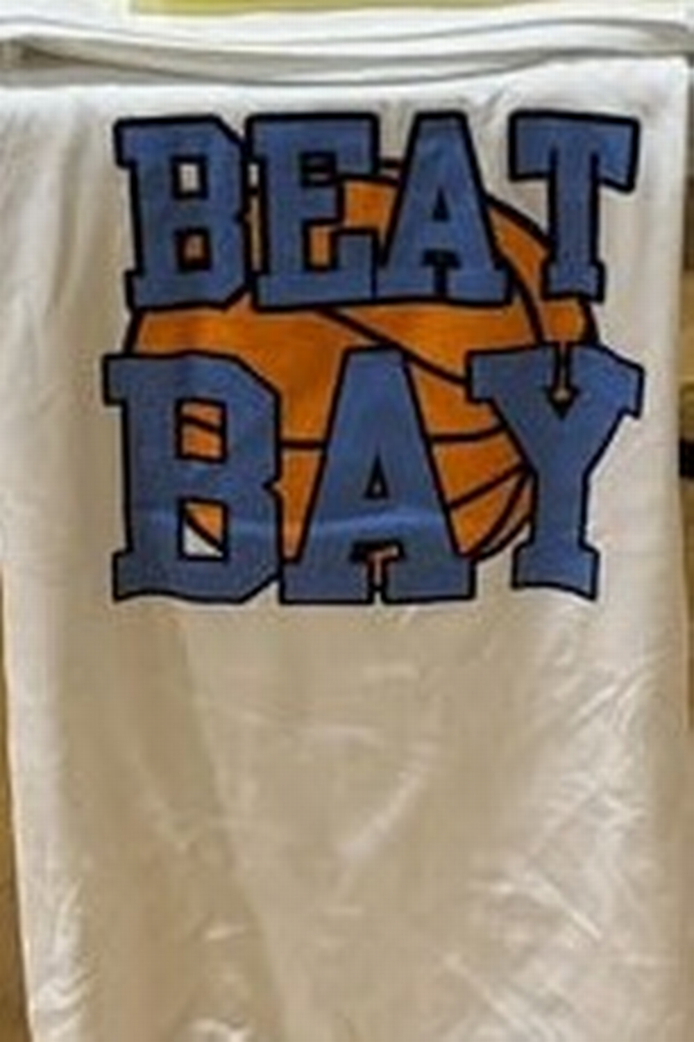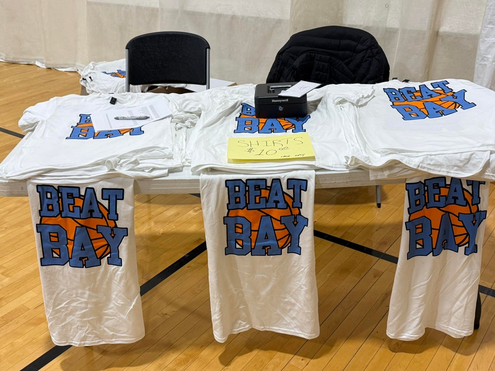 The Morey Courts, an AAU facility surrounded by white curtains, where you can hear whistles and buzzers sounding in courts on the other side of the curtains, was the venue. It was filled with four-row high bleachers around the entire room, and it was filled with screaming fans, many of them Laker baseball players, wearing “Beat Bay” shirts.